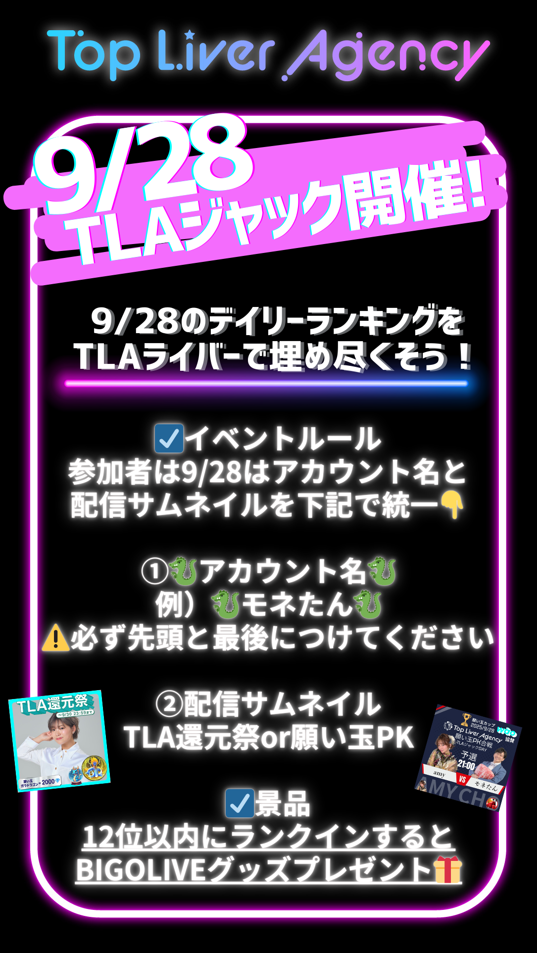 ・景品:🎖️ 12位以内入賞者:TLAよりBIGO LIVE公式グッズをプレゼント